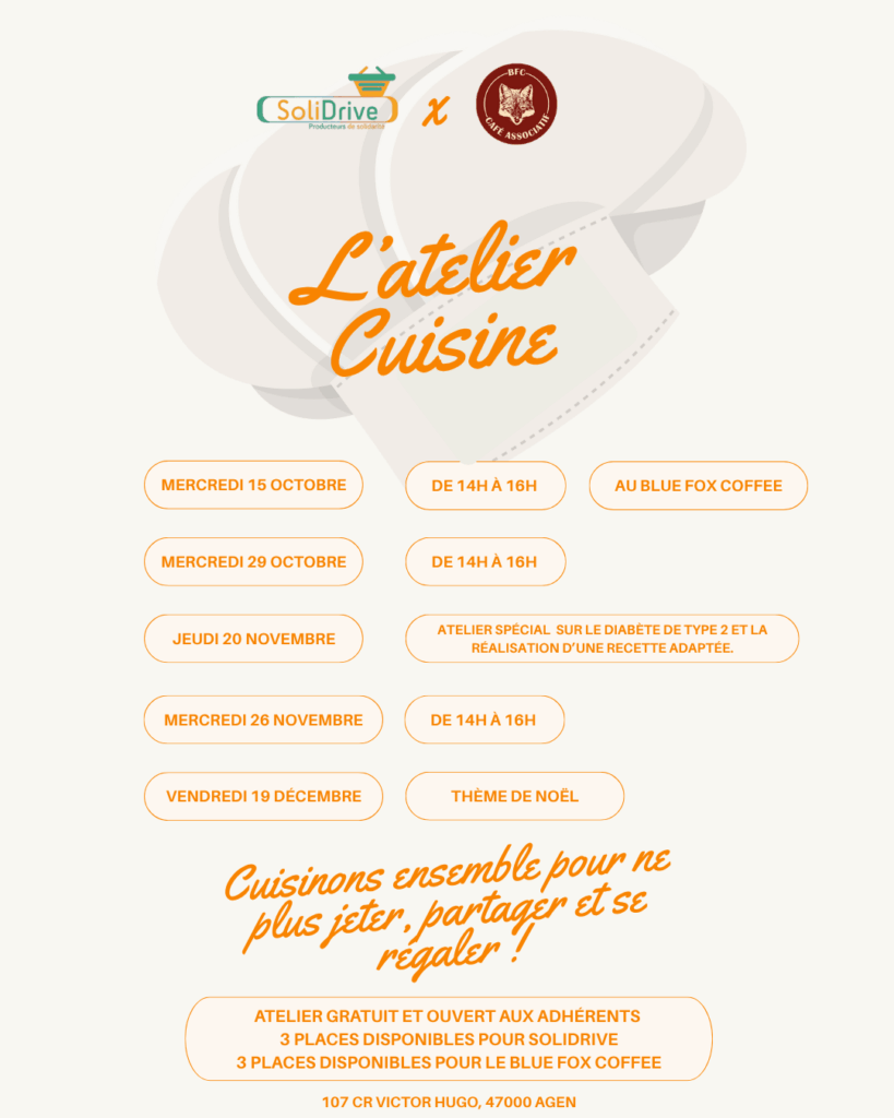 Nous avons le plaisir de vous informer du lancement des ateliers cuisine Solidrive, organisés en partenariat avec le Blue Fox Coffee. Ces ateliers ont pour objectif de lutter contre le gaspillage alimentaire, de créer du lien social et de proposer des recettes simples, économiques et savoureuses, accessibles à tous.